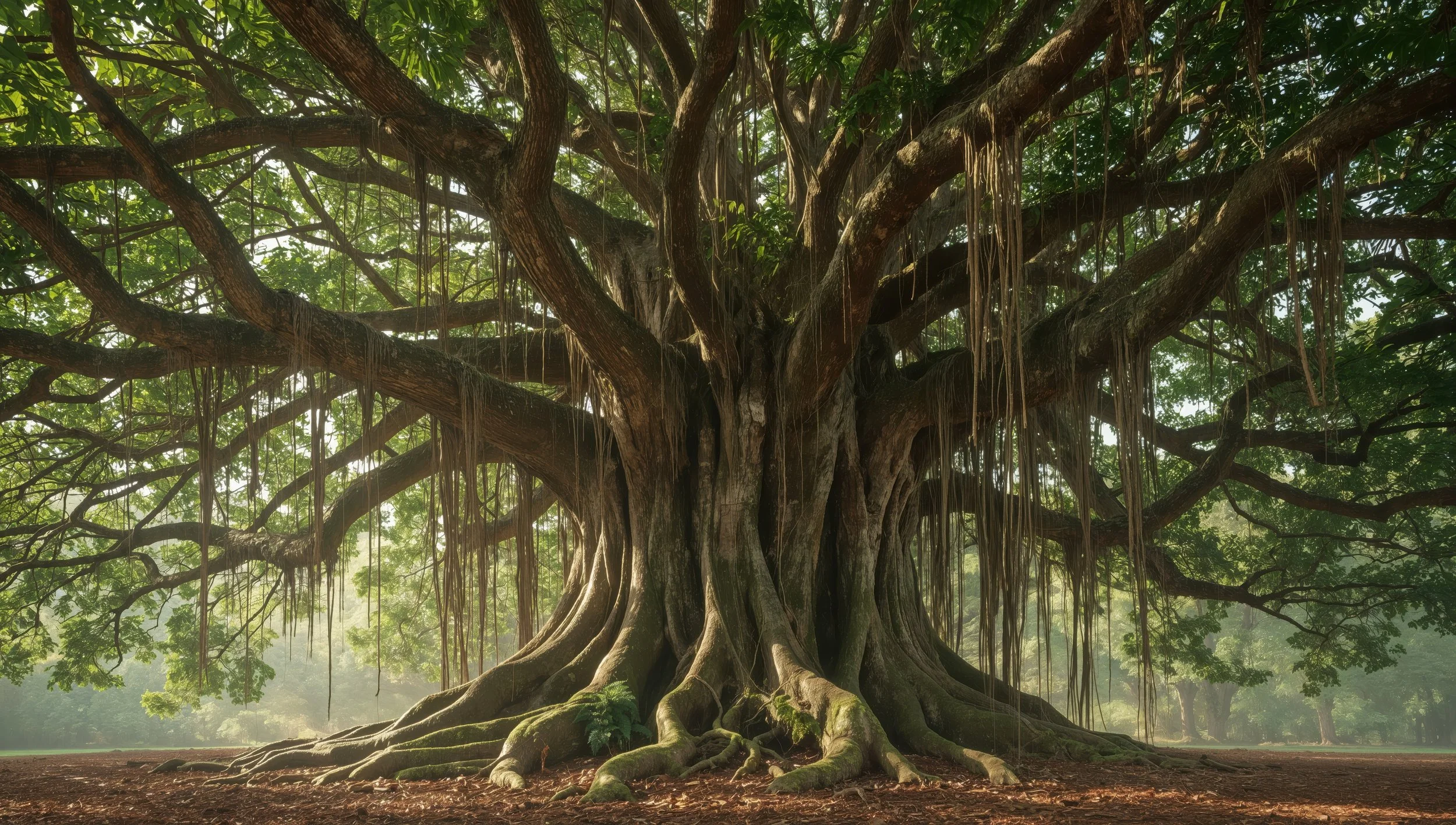 Do you know why some trees grow much bigger? They grow long aerial roots that hang from the branches, reaching for the ground. These roots help the tree adapt and become stronger as they eventually become part of the trunk.